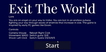 Exit the world is a fast paced roguelite movement shooter. In the game you are an angel on your way to limbo trapped in an endless subway. There are multiple guns and spells at your disposal. The waves get progressively harder as you unlock more spells. The game is inspired by shooters like Doom.